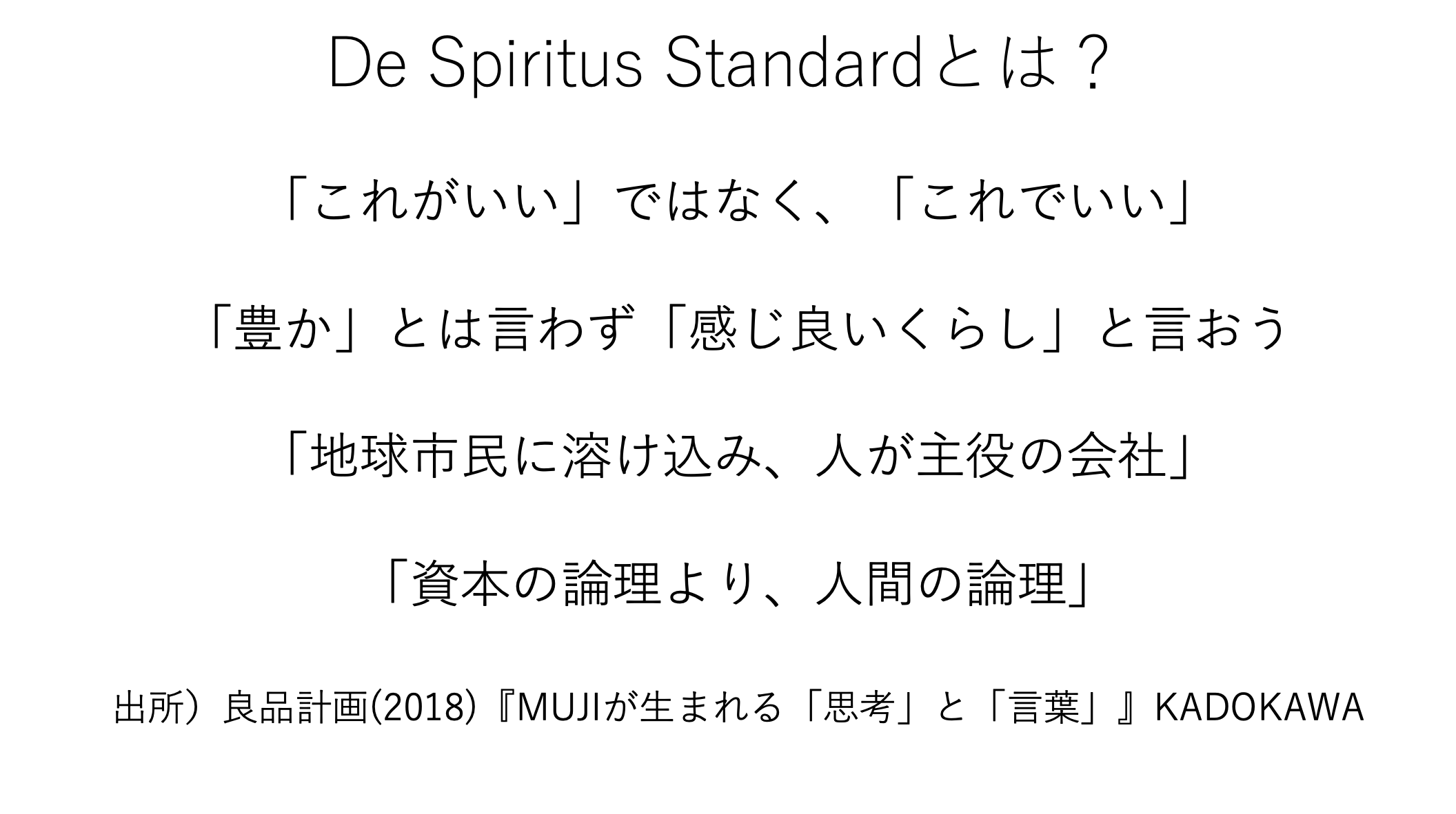 De Spiritus Standardの例として、良品計画が挙げられます。良品計画では、精神的標準を明確に定めていて、これがブランドそのものを形作っています。ミニマリズムを信奉するジョブスが作ったiPhoneも最たる例です。